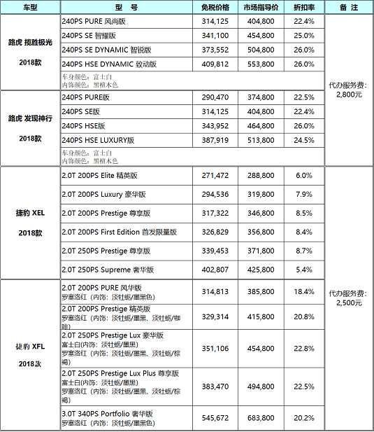奇瑞捷豹路虎2018年3季度留学生免税车价格表已发布,捷豹及路虎品牌免税价格均有较大幅度下调,其中捷豹XEL下调了3.2-5.8万元,调整后免税价格为23.96-34.49万元;捷豹XFL下调了2.6-2.9万元,调整后为23.92-51.70万元;路虎揽胜极光下调了2.6-3.8万元,最新免税价格为28.8万元-37.22万元;发现神行下调了2.3-4.2万元,最新免税价格为26.74-34.55万元。